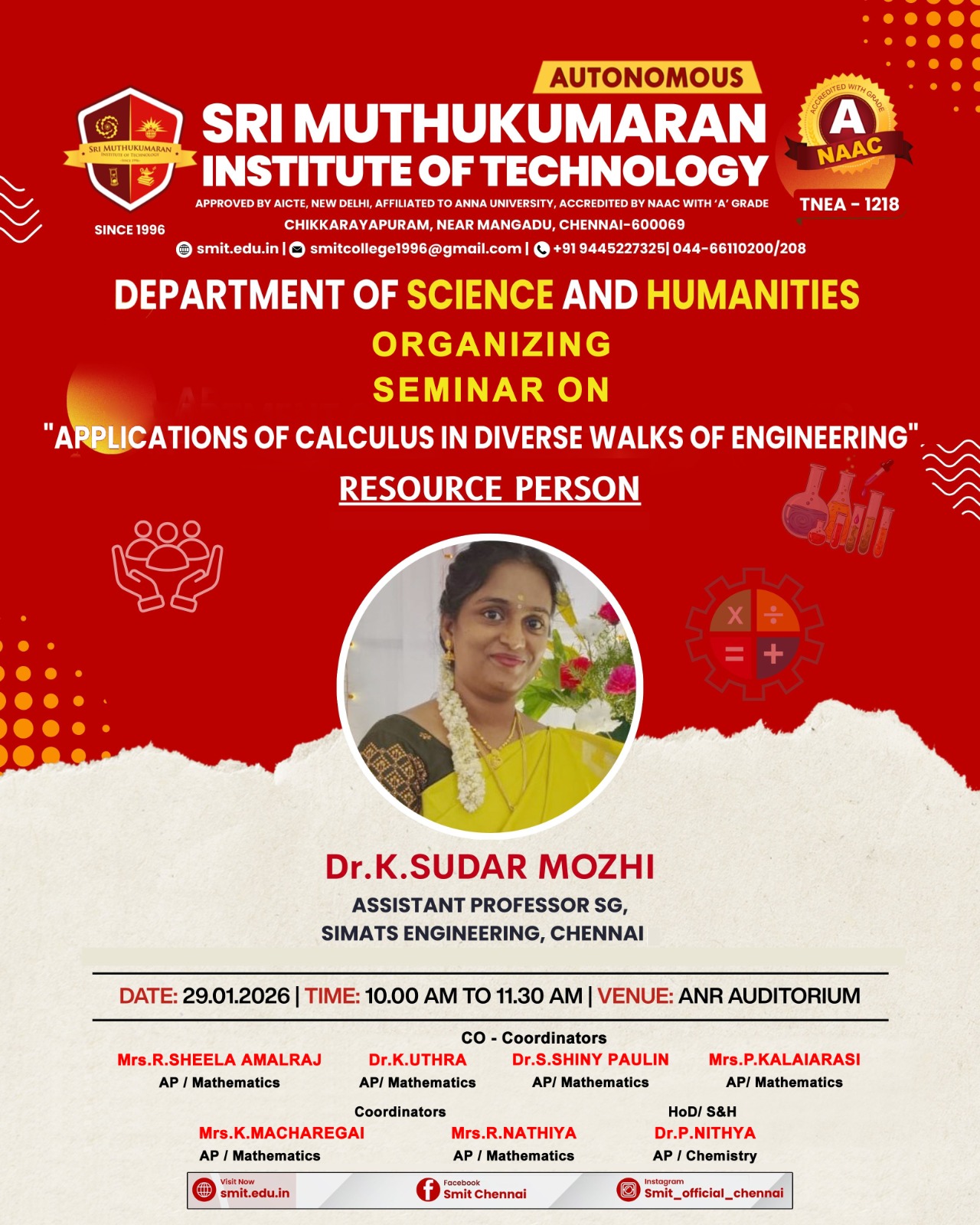 The Department of Science and Humanities is organizing a seminar on “Applications of Calculus in Diverse Walks of Engineering” on 29th January 2026 from 10:00 AM to 11:30 AM at ANR Auditorium. The session will be delivered by Dr. K. Sudar Mozhi, Assistant Professor (SG), SIMATS Engineering, Chennai. The event is coordinated by Mrs. R. Sheela Amalraj and Dr. K. Uthra, with co-coordinators Dr. S. Shiny Paulin, Mrs. P. Kalaiarasi (HoD/S&H), Mrs. K. Macharegai, Mrs. R. Nathiya, and Dr. P. Nithya.