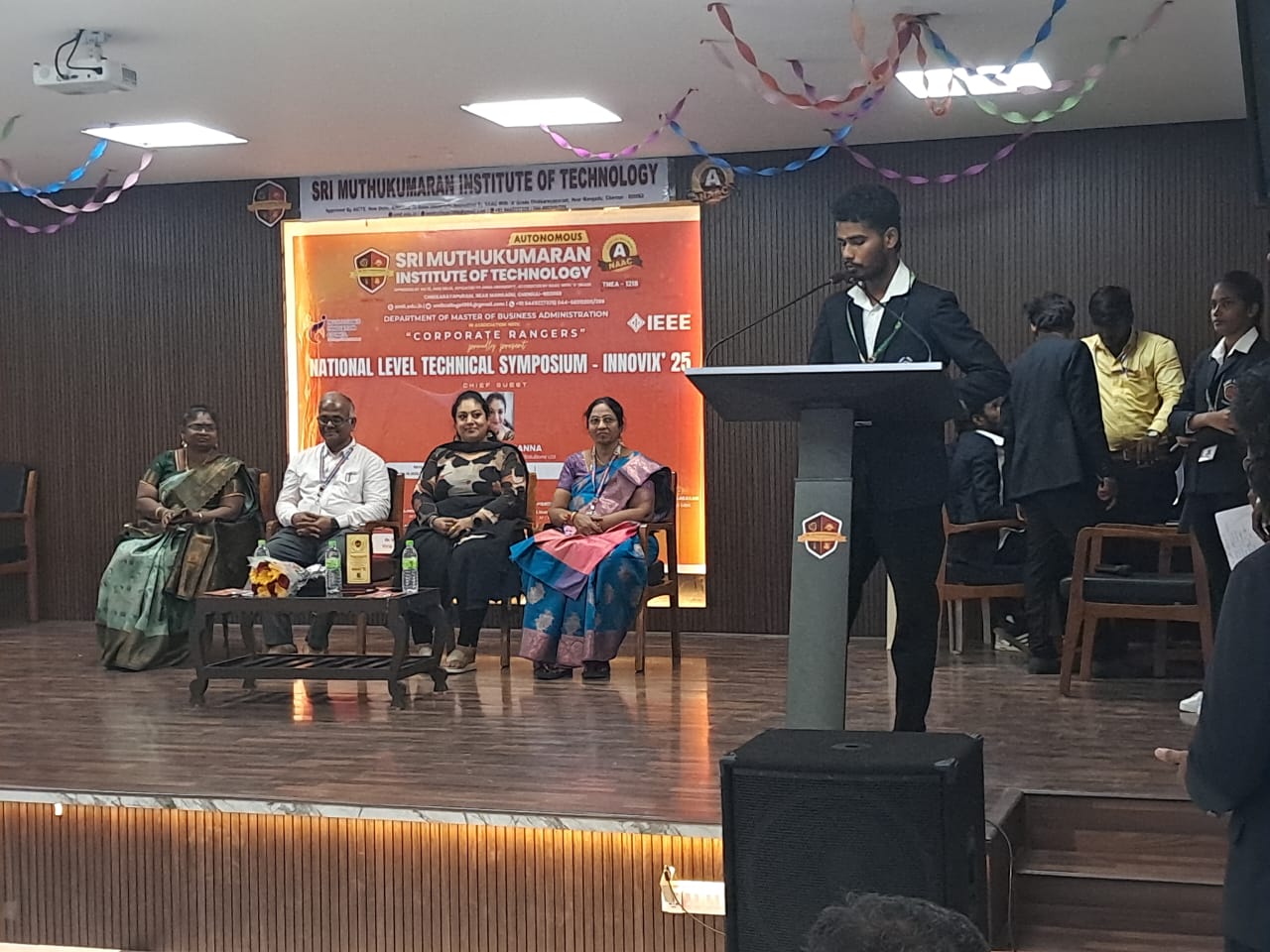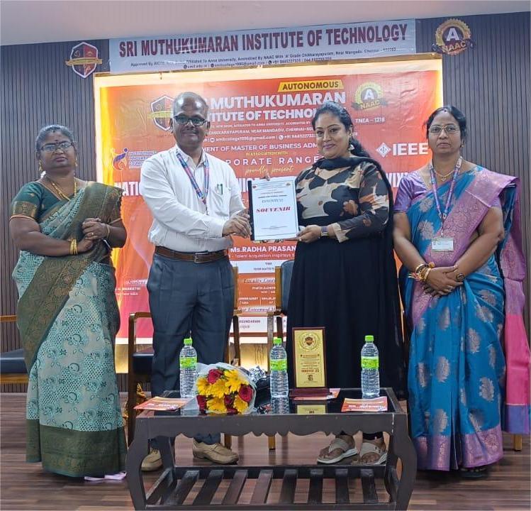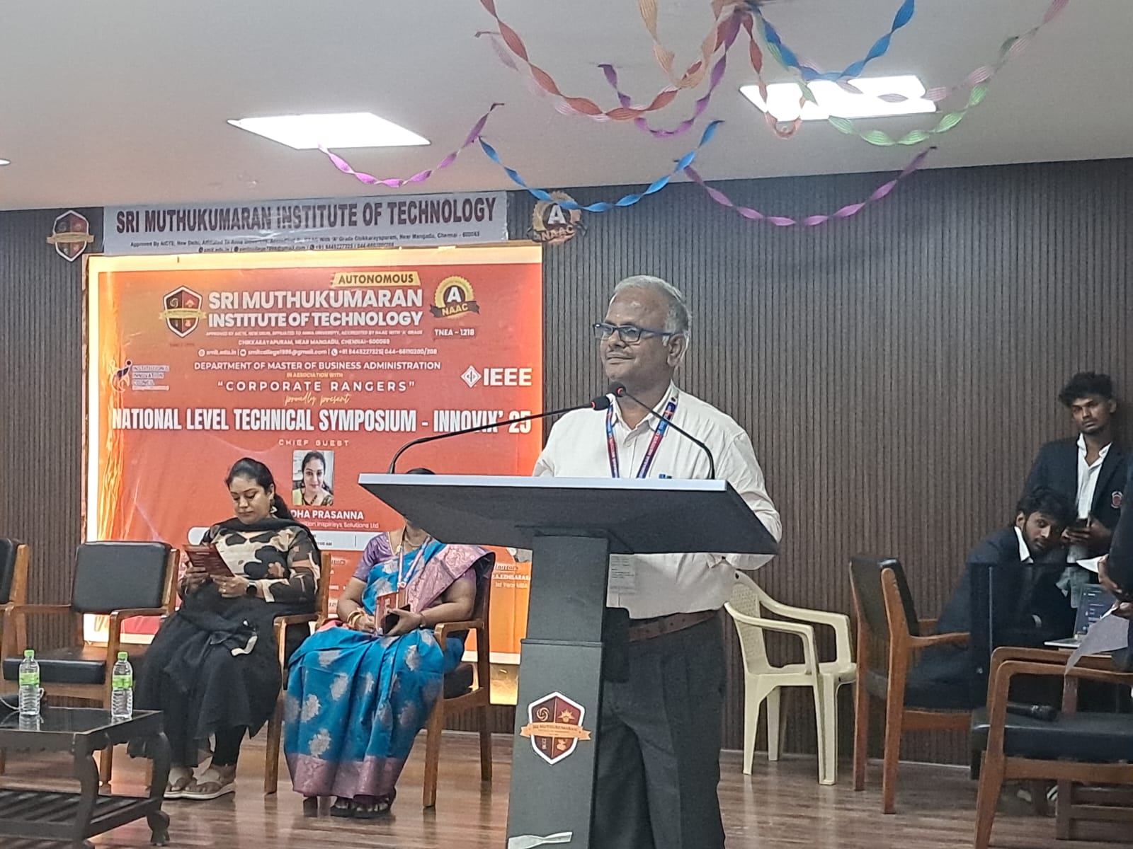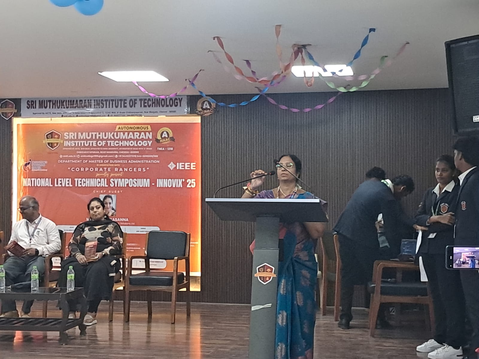 The Department of MBA conducted the INNOVIX’25 Symposium on 24th October 2025. The program commenced at 11:00 a.m. with the presence of our Principal, Vice Principal, and Chief Guest Ms. Radha Prasanna, Head of Talent Acquisition, Chennai. Students from various colleges actively participated in the symposium. Several events such as Paper Presentation, Memory Game, Logo Creation, and Connections were organized as part of the program. Participants enthusiastically took part in all the events. The overall championship trophy was won by Tagore Engineering College, Chennai.